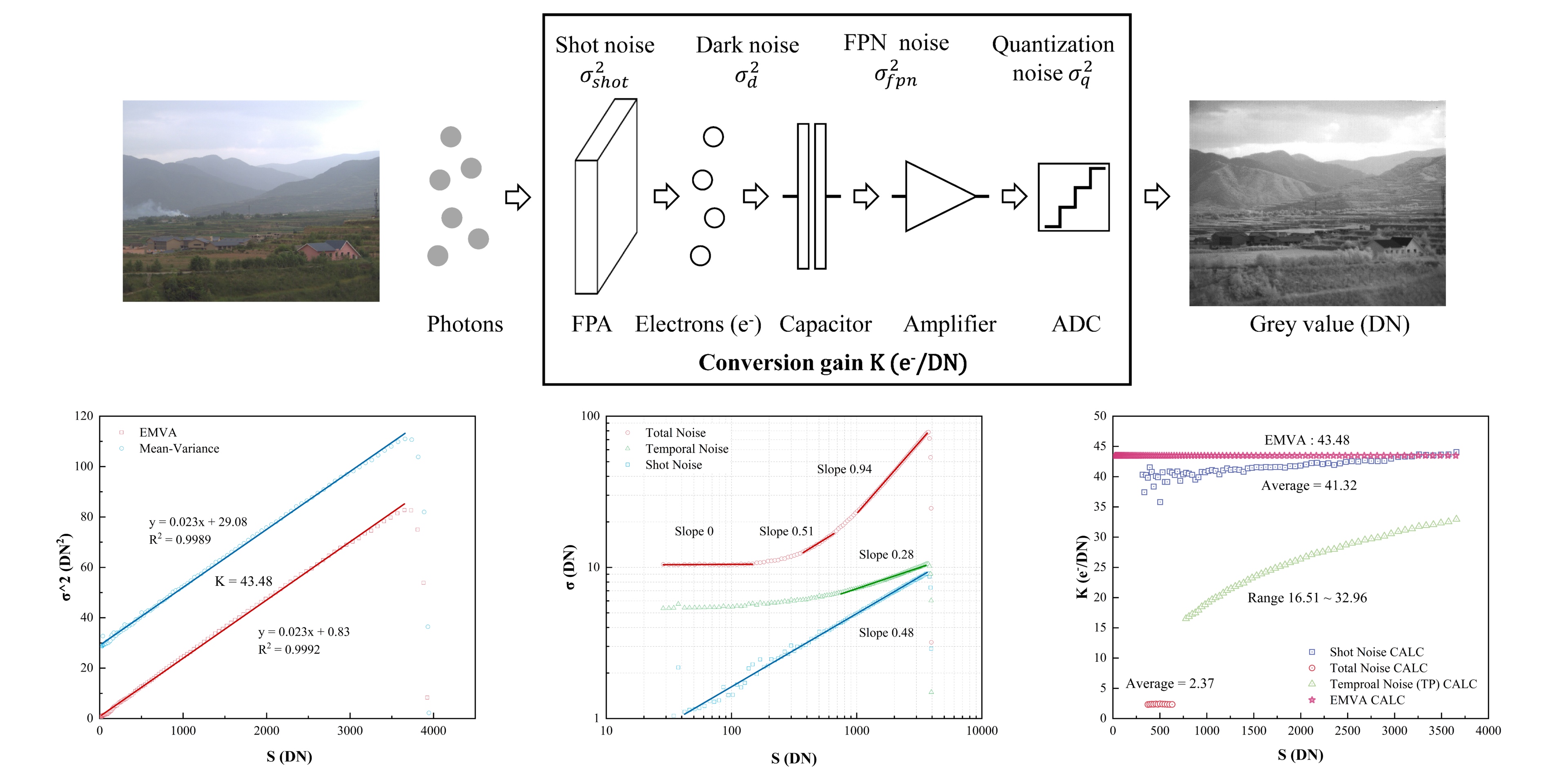 研究团队基于光子转移理论,对国际通行的 EMVA 1288 标准和 Teledyne Photometrics 相机测试协议进行了系统分析。通过理论推导与实验验证,揭示了单一测试方法在非理想条件,尤其是高读出噪声情况下存在的局限性。针对该问题,本研究提出了一种基于光子转移理论的综合分析方法,通过噪声光子转移曲线、均值-方差曲线及转换增益曲线的联合分析,实现了不同测试方法结果的相互验证。实验结果表明,该方法能够在复杂条件下准确确定相机的真实转换增益,较传统方法具有更高的可靠性和适用性。