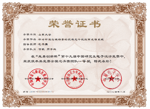 此外,团队抗干扰成像系统方案在“兆易创新杯”第十九届中国研究生电子设计竞赛中荣获技术类竞赛全国总决赛团队一等奖。